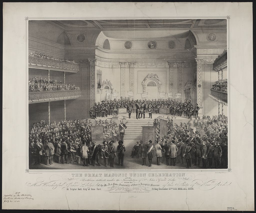 On December 27, 1850, St. John’s Grand Lodge united with the regular Grand Lodge at a Grand Masonic Union Celebration held in Tripler Hall in Manhattan. The above lithograph of the celebration by Charles Crehen was based on a daguerreotype taken at the event. The scrolls piled on the table on the right side of the stage are the new warrants being granted to the former St. John’s lodges. One of them now hangs on the wall of our lodge room.